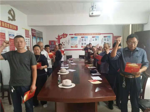 “我志愿加入中國共產(chǎn)黨,擁護(hù)黨的綱領(lǐng),遵守黨的章程,履行黨員義務(wù)……”在汲水鄉(xiāng)張嶺行政村室,汲水鄉(xiāng)黨委副書記王申帶領(lǐng)全體黨員面對(duì)黨旗,一起重溫入黨誓詞,并學(xué)習(xí)黨章黨規(guī)。