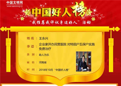 太康縣農(nóng)家出身的王永興熱心公益,累計投資高達(dá)數(shù)千萬元。10月31日上午,10月中國好人榜發(fā)布儀式暨全國道德模范與身邊好人現(xiàn)場交流活動在江蘇連云港舉行,太康縣王永興榮登10月份助人為樂類“中國好人榜”。據(jù)悉,太康縣入選“中國好人榜”人數(shù)已達(dá)42人。