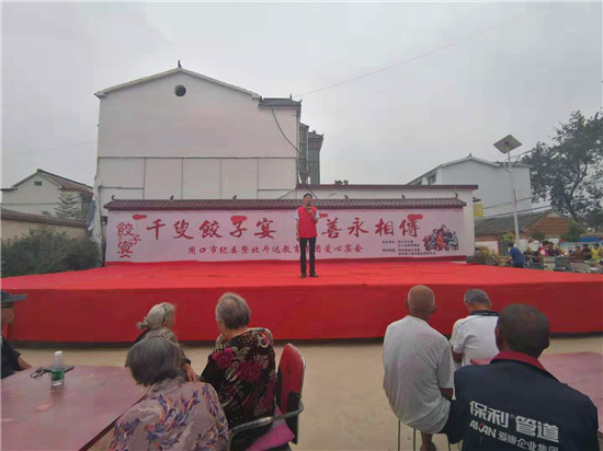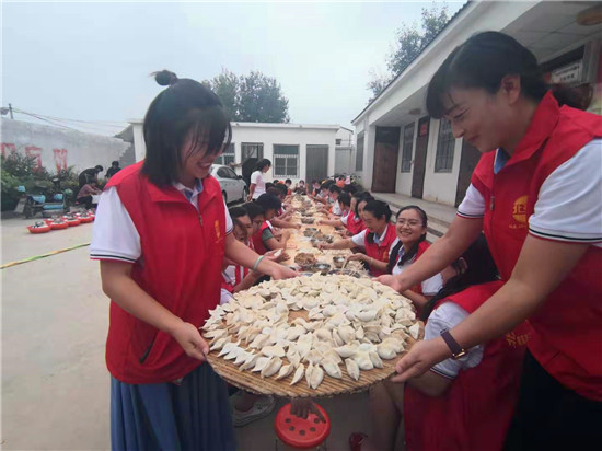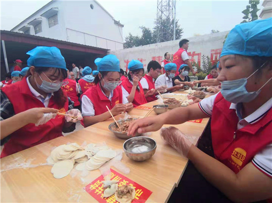 與此同時,在演出現(xiàn)場附近的村委大院內(nèi),由周口市慈孝文化促進會、北斗達教育集團等組成的200多名志愿團隊正忙得不亦樂乎,調(diào)餡、包餃子、下鍋、端盤,兩個多小時內(nèi),他們精心包出20000多個愛心水餃。11時30分,餃子宴正式開始,老人們一邊吃著水餃一邊觀看者演出,喜笑顏開,呈現(xiàn)出一片相親相敬的溫馨畫面。