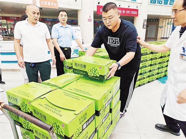 9月7日下午,來自黃泛區(qū)農(nóng)場的時(shí)先生(右二)將270箱自家農(nóng)場種植的葡萄捐贈給周口港區(qū)醫(yī)院,與醫(yī)護(hù)人員一起分享雙重喜悅:自家果園的豐收和他個(gè)人的身體康復(fù)。