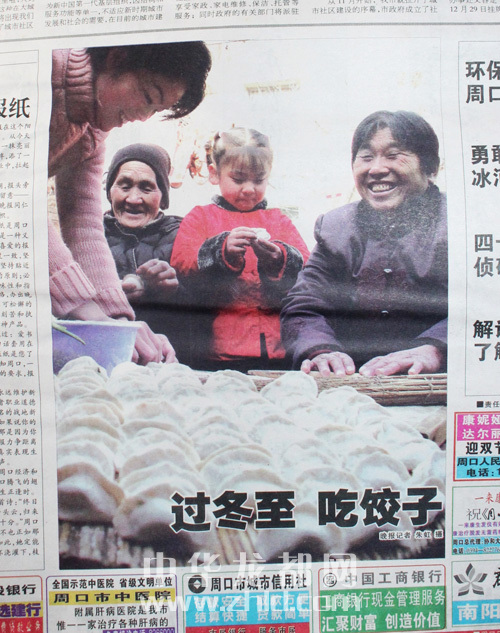 ????創(chuàng)刊號(hào)頭版壓軸圖片《過(guò)冬至,吃餃子》,拍攝的是80多歲的姥姥、50多歲的媽媽、30多歲的媳婦、五六歲的小女孩四世同堂歡天喜地包餃子的場(chǎng)景。媳婦搟餃子皮,姥姥、媽媽包餃子,五六歲的小女孩也來(lái)湊熱鬧,拿起一個(gè)餃子皮學(xué)著大人的模樣包餃子,剛剛包好的一大鍋蓋餃子令人垂涎。特別是按照晚報(bào)的送報(bào)時(shí)間,創(chuàng)刊號(hào)報(bào)紙送到千家萬(wàn)戶時(shí)正好是上午11時(shí)之前,此時(shí)正是人們包好餃子準(zhǔn)備煮餃子的時(shí)間。可想而知,大家一邊品讀屬于周口人自己的晚報(bào)、欣賞和諧家庭歡天喜地包餃子的圖片,一邊把包好的餃子下到沸騰的開(kāi)水鍋里,那煮出的餃子香味和著晚報(bào)濃濃的墨香,香飄滿城,沁人心脾。