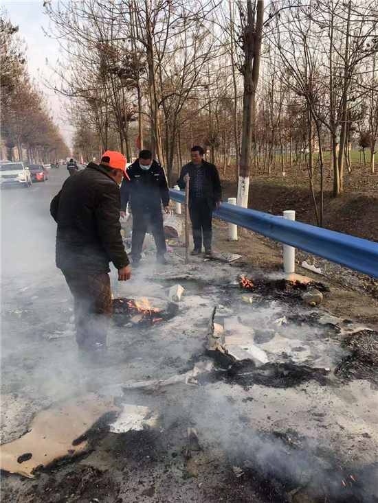當日下午4點左右,太康縣交警大隊二中隊指導員南應開及輔警郭旗全、魯?shù)?、尹晨豪正在趙堂村附近巡邏時,猛然看到前方一輛電動三輪車上有煙氣冒出,巡邏民警加速趕到。原來是一名老漢的一輛拉著廢舊紙箱的電動三輪車著了火,一車廢紙和塑料瓶散落一地正在燃燒,火越燒越旺,只見老漢正在手忙腳亂地滅火。這輛三輪車上拉的全是廢塑料、硬紙殼等易燃物,而且當時正刮著風,如果不及時滅火任由火勢蔓延,后果將不堪設想??吹酱饲闆r后,南應開迅速從警車上拿出滅火器秒變“消防員”,對著起火的物品進行滅火操作,同時安排輔警對過往行人和車輛進行疏導。由于發(fā)現(xiàn)和撲救及時,在民警的緊急救援下,火源很快被眾人合力撲滅。對太康交警面對火情臨危不亂、果斷處置、幫助群眾的行為,老漢車主和過往群眾紛紛點贊。②6