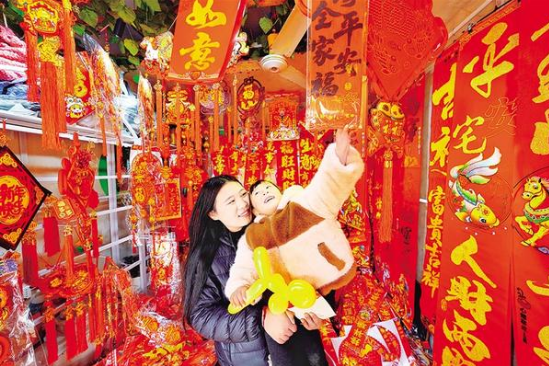 新春將至,年味漸濃。2月12日,在掛滿福字與春聯(lián)的商鋪里,市民懷抱著孩子認(rèn)真挑選,指尖拂過紅彤彤的春聯(lián)紙,目光里滿是對(duì)新年的期許。