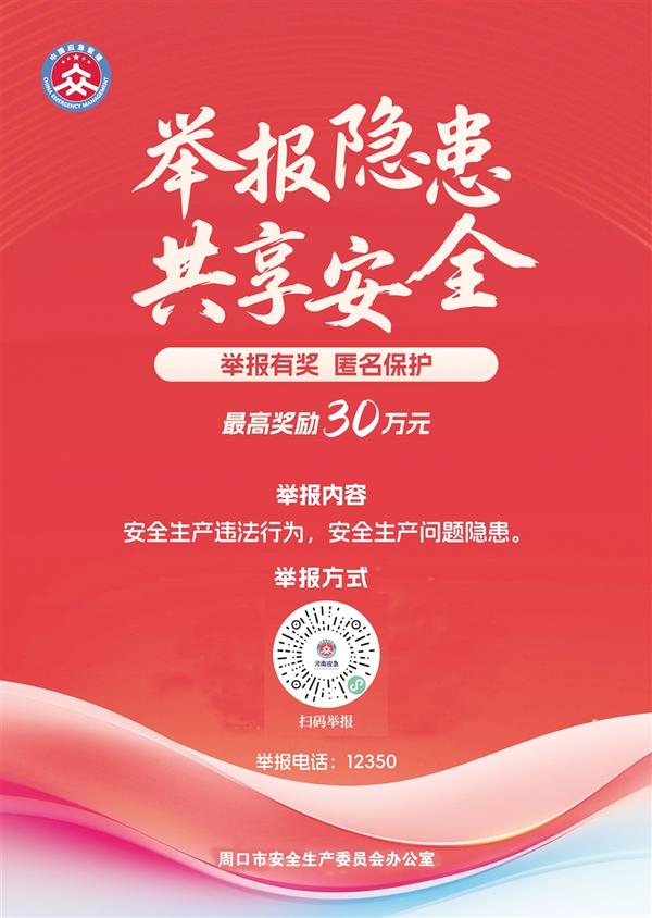 周口市安全生產(chǎn)委員會辦公室以舉報電話、掃碼舉報等方式,受理群眾舉報安全生產(chǎn)非法違法行為線索。一經(jīng)查實,我們將依據(jù)《河南省安全生產(chǎn)領(lǐng)域舉報獎勵實施辦法》相關(guān)規(guī)定,對舉報人予以獎勵,最高獎勵金額30萬元。我們將對舉報人個人信息進行嚴(yán)格保密,依法保護舉報人的合法權(quán)益。