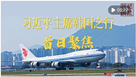 當(dāng)天上午,習(xí)近平主席乘專(zhuān)機(jī)抵達(dá)韓國(guó)釜山,韓國(guó)外長(zhǎng)趙顯等高級(jí)官員在機(jī)場(chǎng)熱情迎接,禮兵分列紅地毯兩側(cè)致敬,軍樂(lè)團(tuán)演奏行進(jìn)樂(lè),機(jī)場(chǎng)鳴放21響禮炮。