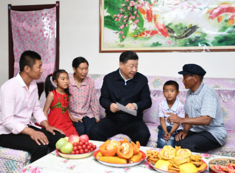 2019年8月21日,習(xí)近平總書(shū)記在甘肅武威市古浪縣黃花灘生態(tài)移民區(qū)富民新村村民李應(yīng)川家,同李應(yīng)川一家拉家常。新華社記者 謝環(huán)馳 攝