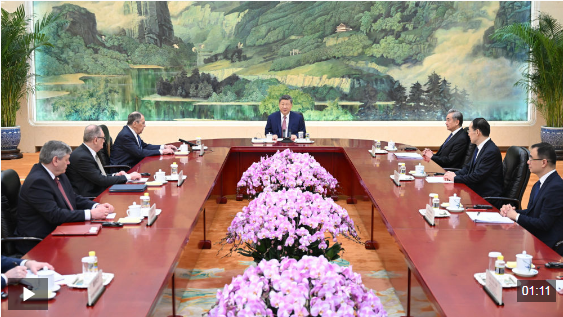 拉夫羅夫說:“尊敬的主席先生,此次會見體現(xiàn)了您對俄中新時代全面戰(zhàn)略協(xié)作伙伴關(guān)系的重視。俄中在貿(mào)易、經(jīng)濟(jì)、投資、人道主義、文化等領(lǐng)域的合作發(fā)展勢頭良好,您和普京總統(tǒng)給我們未來合作擘畫了藍(lán)圖?!?/p>