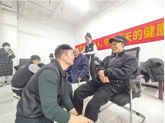 3月7日,志愿者在幫老人按摩。當(dāng)日,市中小企業(yè)商會(huì)聯(lián)合愛(ài)心人士來(lái)到川匯區(qū)中心敬老院開(kāi)展以“關(guān)愛(ài)老人·傳遞溫暖”為主題的公益慰問(wèn)活動(dòng)。志愿者不僅和老人拉家常、為老人按摩,還為他們帶來(lái)了米、面、油和醫(yī)用口罩等物品。