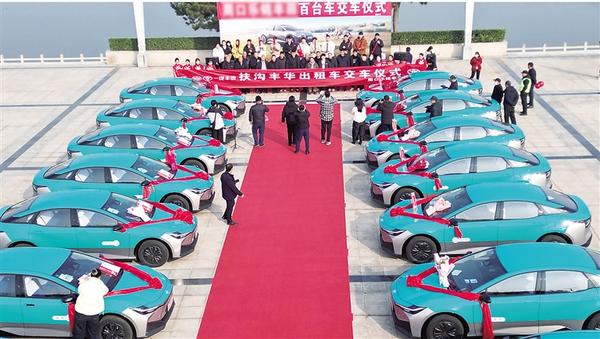 12月19日上午,周口和諧廣場舉行純電動出租車交付儀式,一百輛全新純電動轎車正式交付扶溝出租車公司并投入運營。