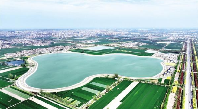 近日,記者利用無人機(jī)俯瞰引江濟(jì)淮鄲城縣配套工程蓄水庫,碧水如琉璃,形若“寶葫蘆”。