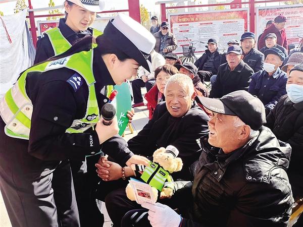 11月28日,民警將“交警小熊”送給一位村民。當(dāng)日,商水縣公安局交通警察大隊(duì)組織民警、輔警,攜手縣豫劇中心走進(jìn)湯莊鄉(xiāng)西趙橋村,開展“美麗鄉(xiāng)村行”交通安全宣傳活動(dòng),通過營造宣傳氛圍,讓群眾自覺遵守法律法規(guī),安全文明出行。