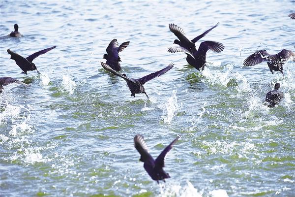 11月16日,在淮陽龍湖國家濕地公園,一群國家二級保護(hù)動物白骨頂雞在此集結(jié)。